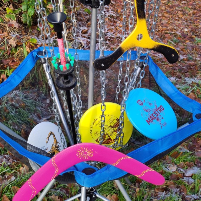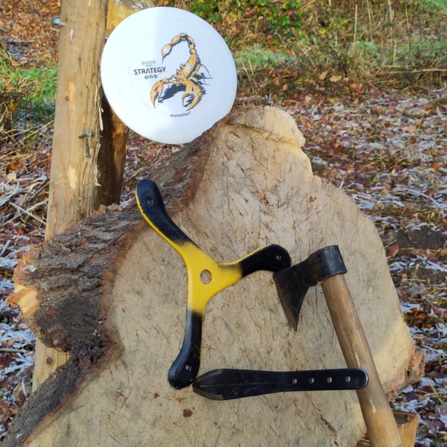 Der Bumerang kehrt zurück, das Messer steckt im Holz und der Disc landet im Zielkorb.